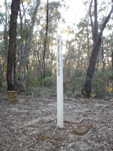 Let’s try further on from the start of this path. Through the bush, I catch a glimpse of something white showing through the trees. As I get nearer a small stone seating encircles a single white post like those used in street signs but without any cross pieces. Just a single white post pointing to the sky with the message “May peace prevail on earth” painted vertically in black on one face. On the other faces the same message I presume but on one face in French, on another in Spanish and on the last face, Chinese characters.