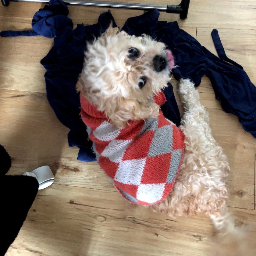 The strength in Miss Rosie’s back legs deteriorated in later life to the extent that she was unable to negotiate the back steps of our house in oder to do her ablutions. This led to my becoming her “Uber” driver as I had to pick her up and carry her down the steps, wait for her to do her business and then repeat the process back up the steps. Miss Comfort of course adapted to this change of circumstance very well and would cuddle into my shoulder quite readily to avoid having to expend any more energy than was absolutely necessary. We had to buy a little cart for her to sit in as Daisy and I went for a walk and from there she would call out to any other people we met and encourage them to give her a pat.