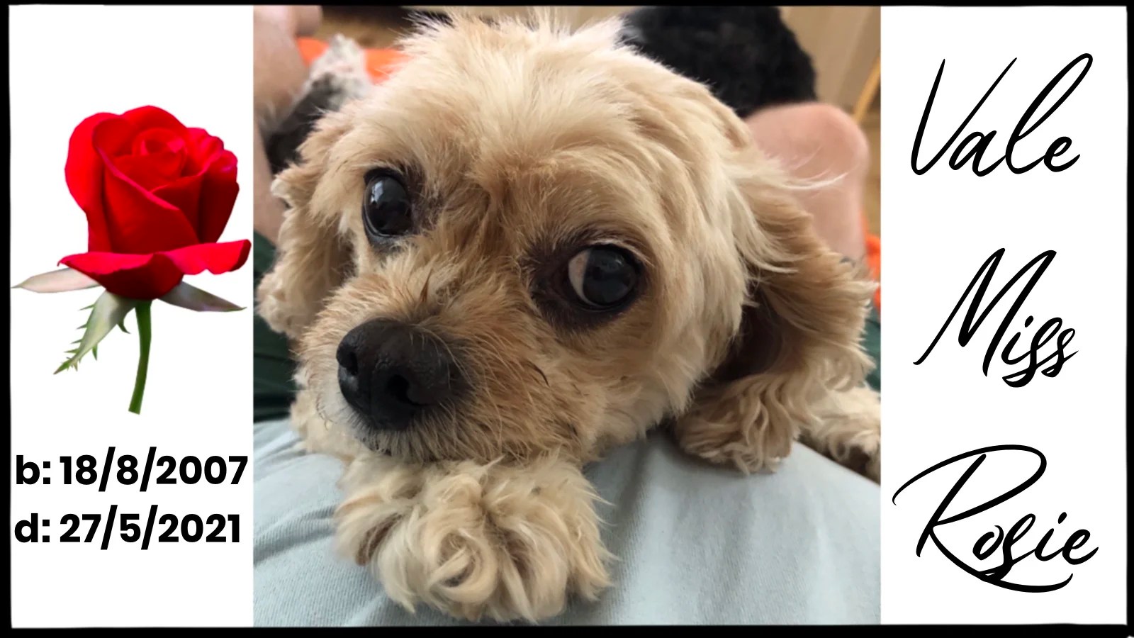 Miss Rosie, Little Miss Comfort, Wosie Wuth the Wascally Wabbit, The Rose, Love Bug, Miss Cuddles, Wuppy, Sister were all titles accorded to this wonderful cavoodle dog who graced us with her presence for nearly 14 years.