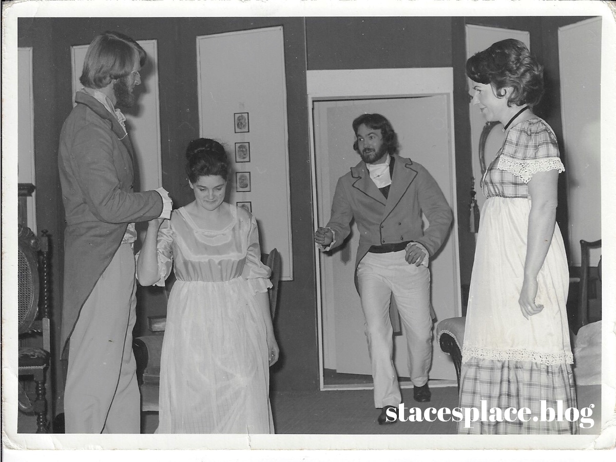 The theatre group, Te Puke Repertory Society, has been in operation since 1952 and is still going strong although no doubt facing problems with the current pandemic curtailing performances. The play I was auditioning for was “I Have Five Daughters” written by Margaret MacNamara based on Jane Austen’s novel “Pride and Prejudice” and the role I was cast in was Charles Bingley. A photo of one of my entrances is shown above. I still have the original programme and photos from the production in my theatre scrapbook. My memories of the production other than that are faint but I do recall the almost absolute terror mixed with excitement that preceded my first entrance. I think I got through without dropping a line and my performance was probably adequate for an absolute novice. It must have been good enough because I went on to do another five plays with them over the next few years.